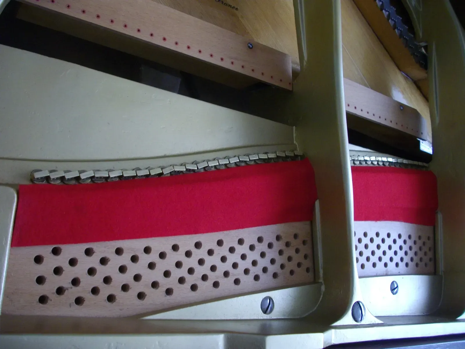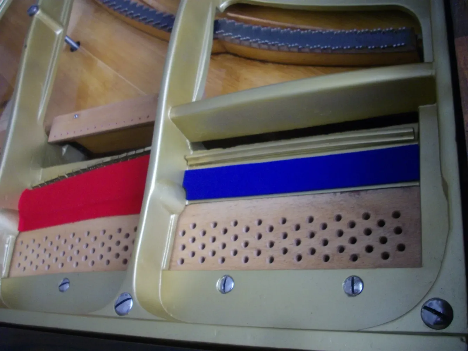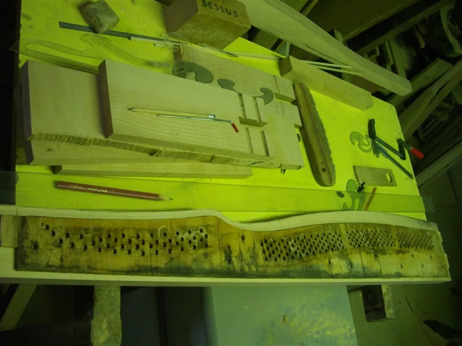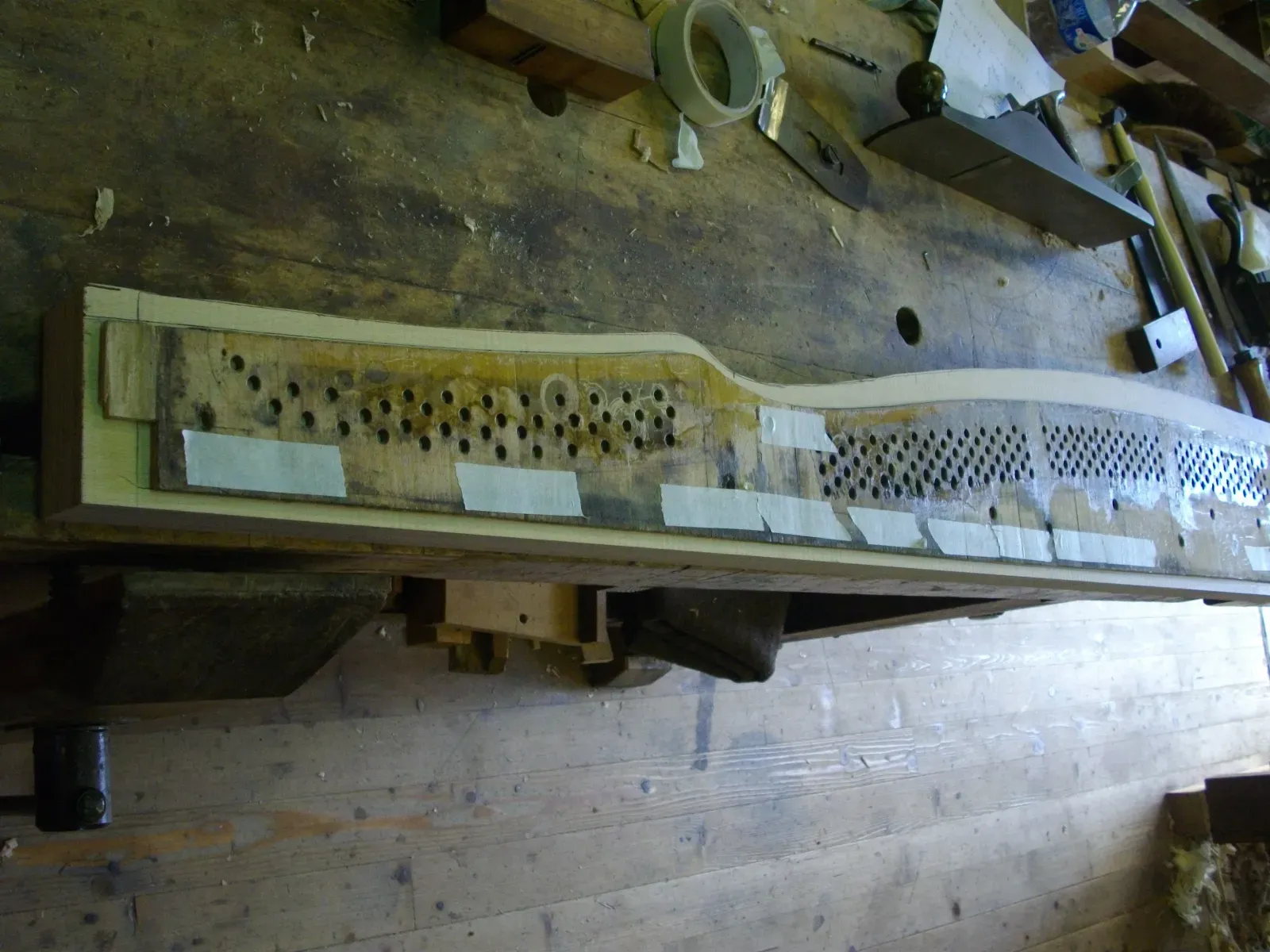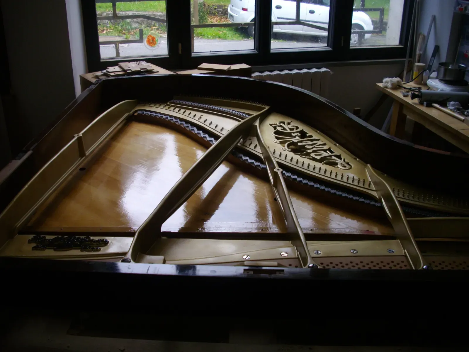 Parfait exemple d'une restauration complète, qui comprend ici le remplacement du sommier de chevilles, souvent fendu avec l'âge et qui ne permet plus la tenue d'accord. Travail invasif et conséquent mais qui assure à l'instrument à nouveau un siècle de durabilité !