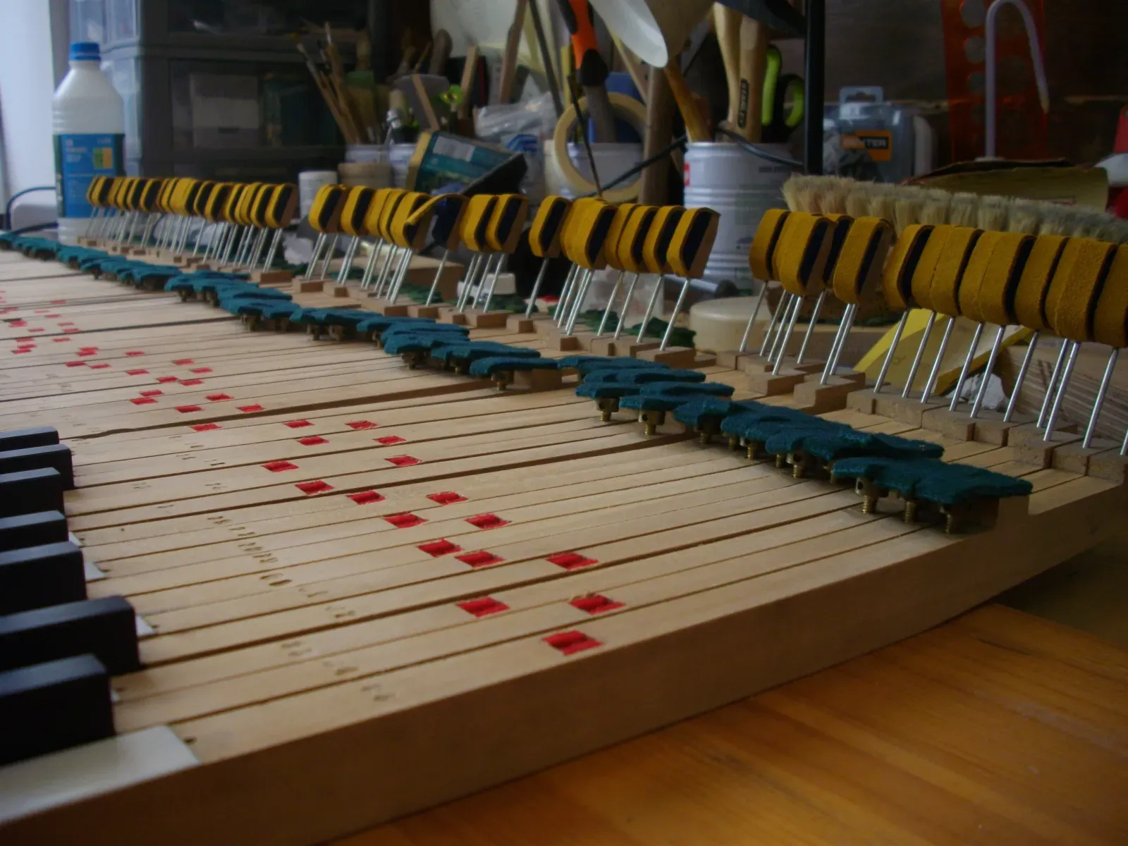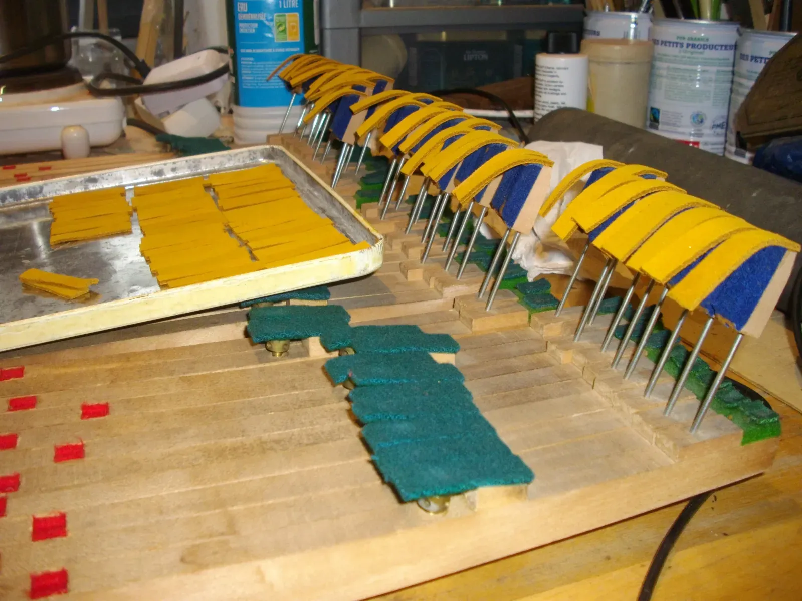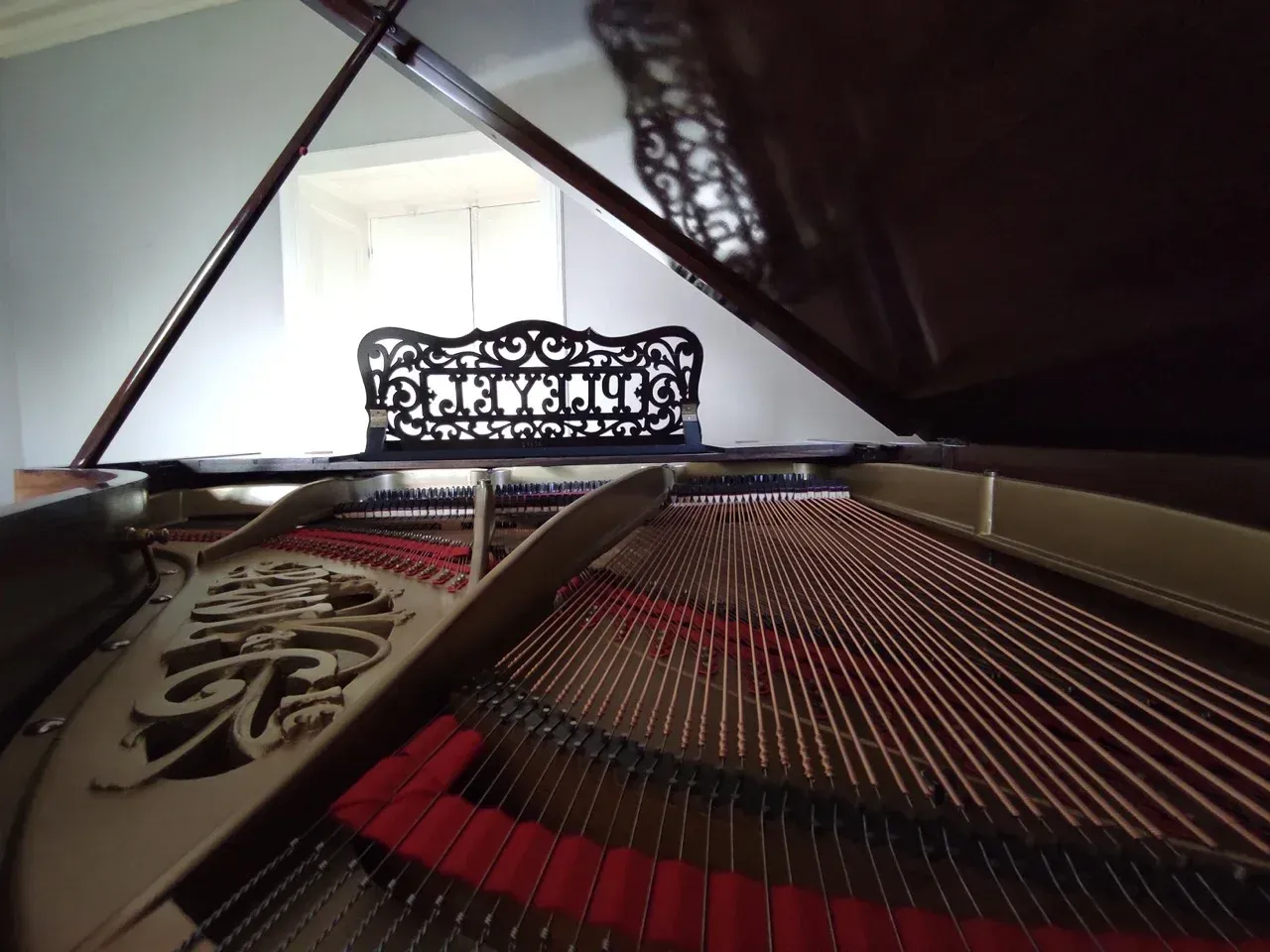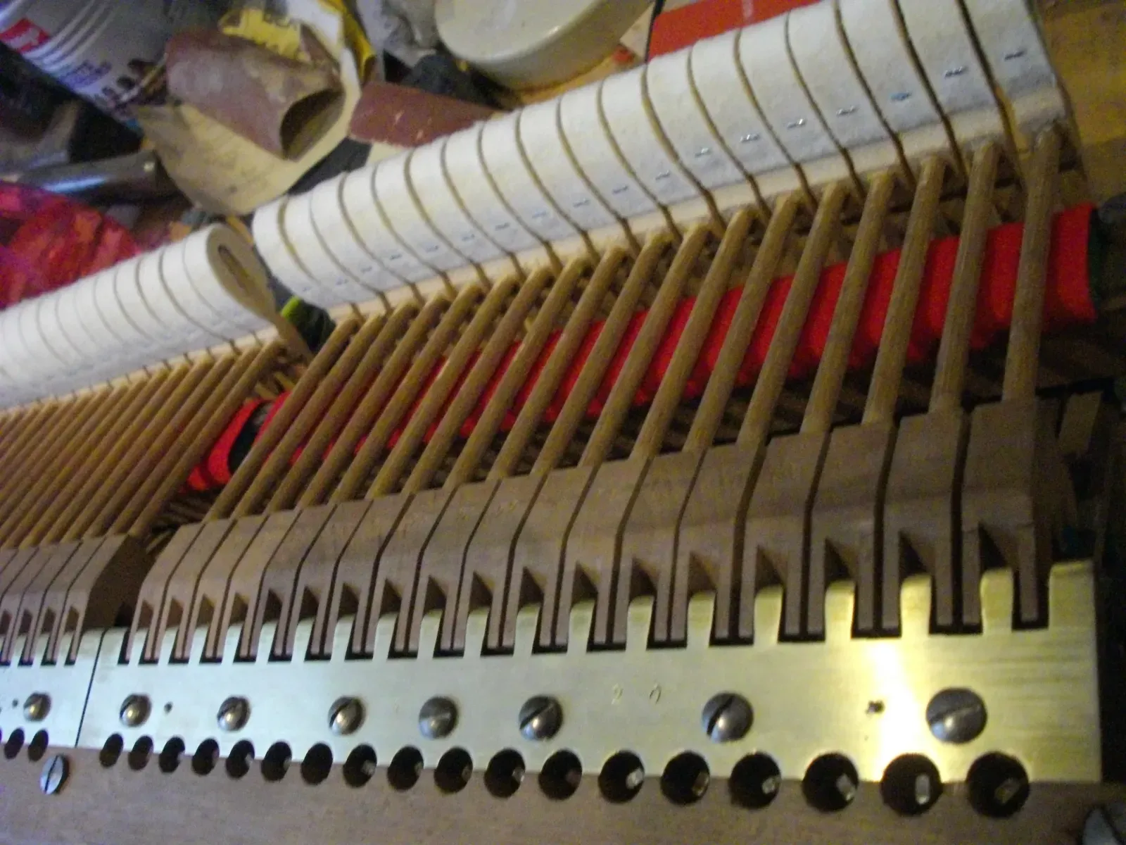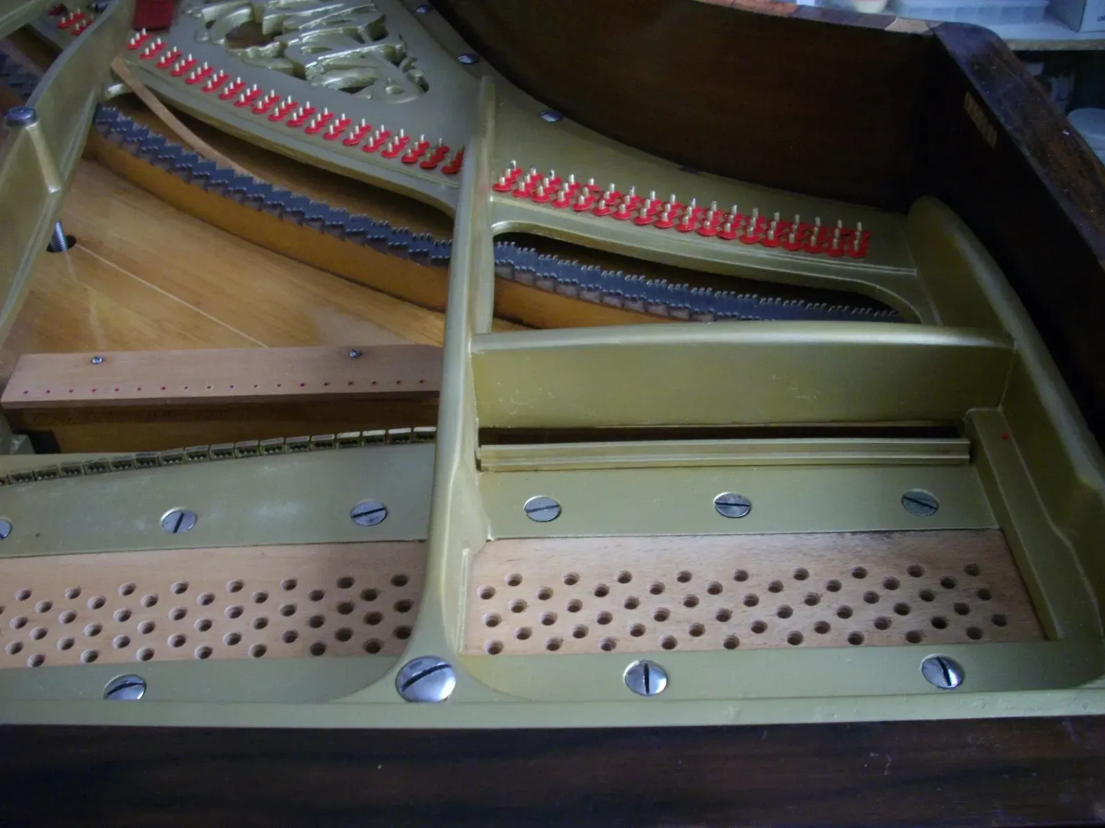 Parfait exemple d'une restauration complète, qui comprend ici le remplacement du sommier de chevilles, souvent fendu avec l'âge et qui ne permet plus la tenue d'accord. Travail invasif et conséquent mais qui assure à l'instrument à nouveau un siècle de durabilité !