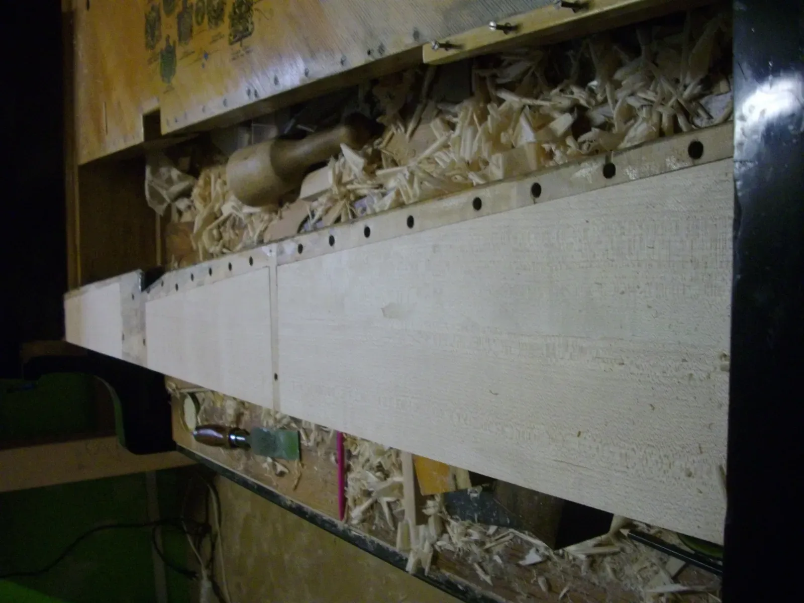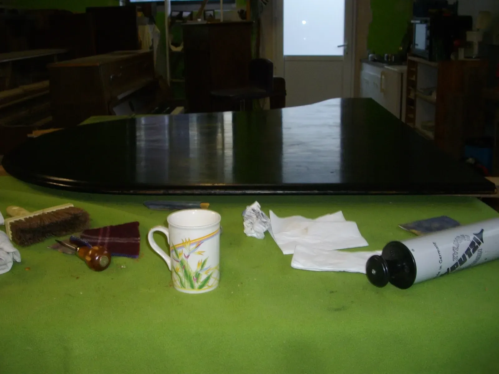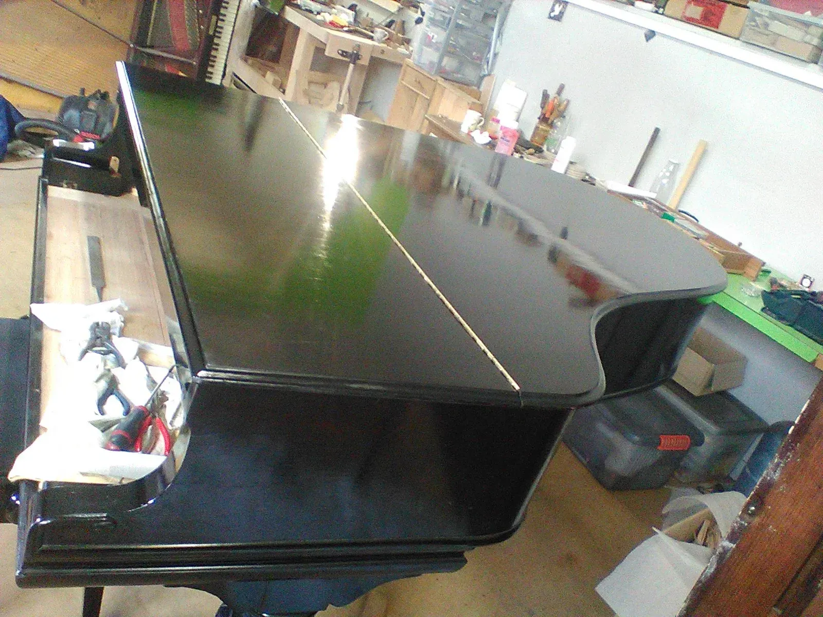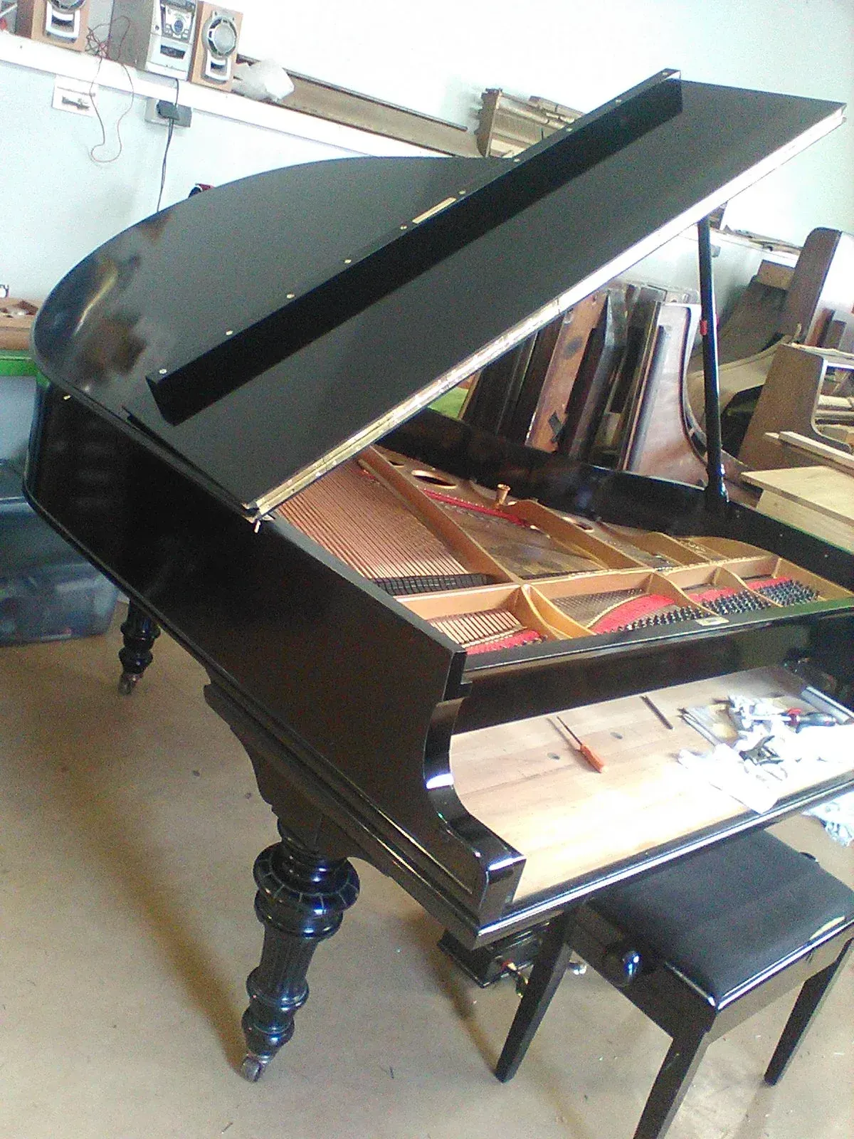 Le Couvercle de l'instrument qui était très abîmé a été reverni dans l'esprit du reste du meuble, avec retour au nu du bois, raclage/ponçage/rempli/vernis, une opération qui s'est étalée sur plusieurs mois comme dans la tradition Steinway.